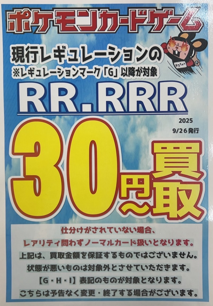 ポケカ買取情報! 現行レギュレーションのRRの買取をアップいたしました! 2025年9月26日 ポケカ買取情報! 現行レギュレーションのRRの買取をアップいたしました! 是非当店にお持ち込みください! ※2025/9/26現在の価格となります。 在庫状況・状態によってお値段が変動いたします。予めご了承ください。 **************** こちら↓もぜひチェックしてみてくださいね♪(*´▽`*) ・最新のイベント情報はこちら ・最新の買取情報はこちら