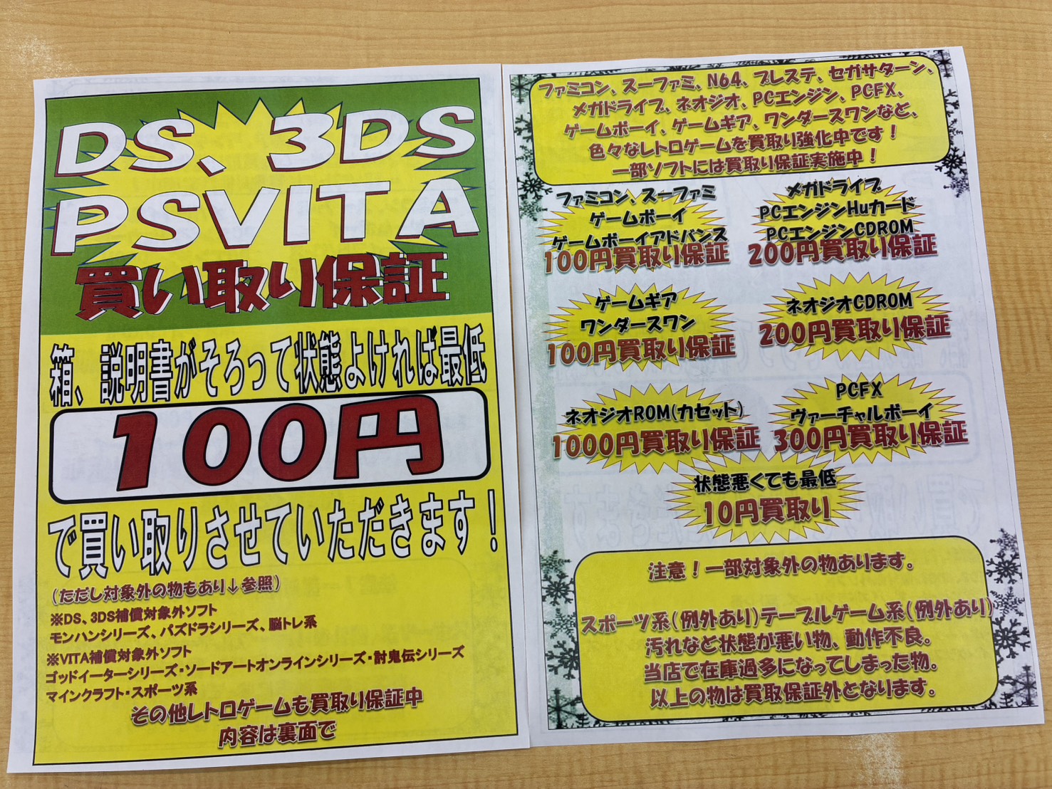 ★レトロゲーム情報★ 2025年10月27日 ただいまレトロゲーム部門では買い取り保証を実施しています。 状態が良ければ保証対象となりますのでぜひ当店へお持ちください。 ※2025/10/27現在の価格となります。 在庫状況・状態によってお値段が変動いたします。予めご了承ください。 **************** こちら↓もぜひチェックしてみてくださいね♪(*´▽`*) ・最新のイベント情報はこちら ・最新の買取情報はこちら