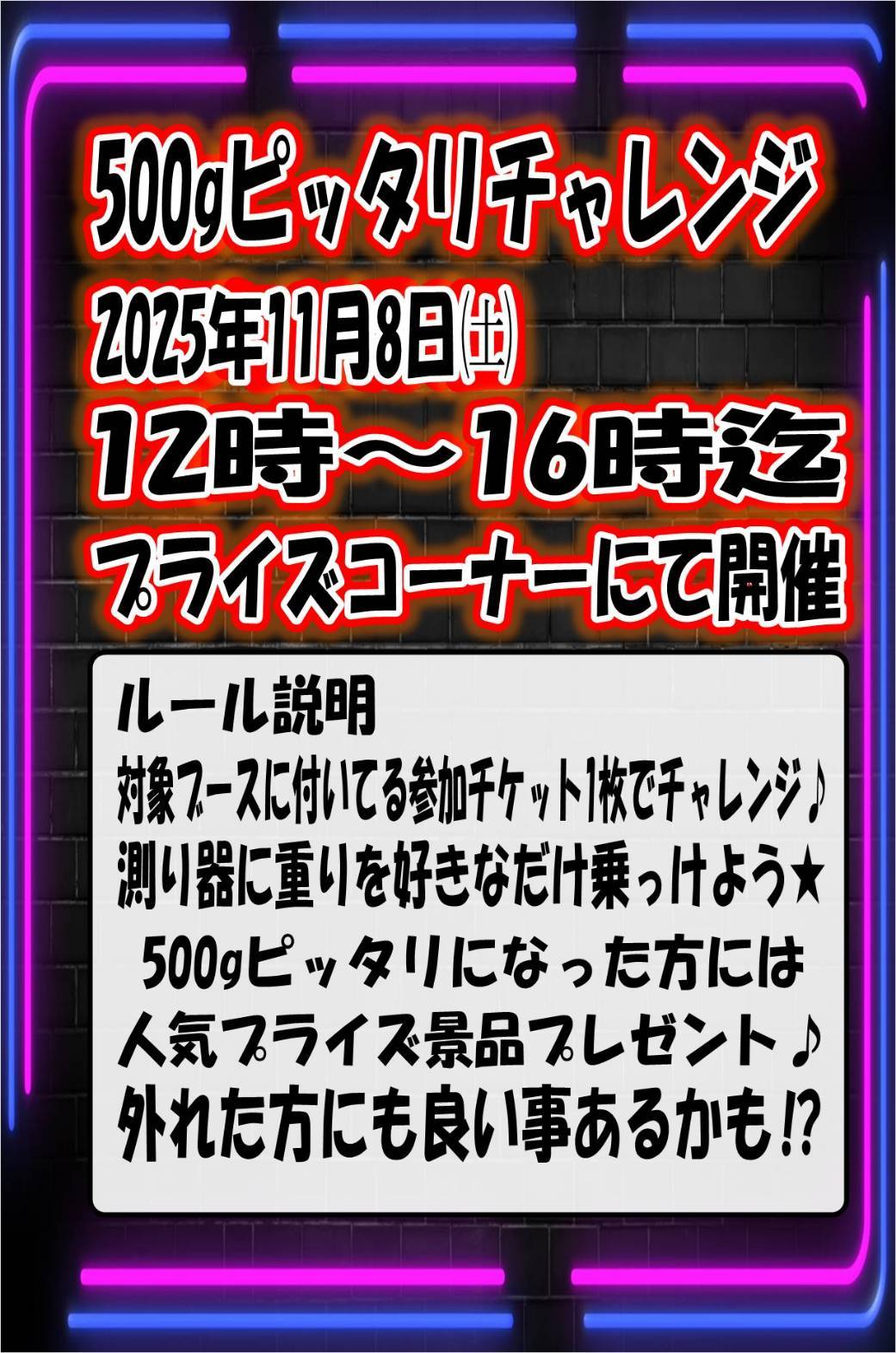 ★11月8日㈯は ★500gピッタリチャレンジ★ 2025年11月8日 プライズコーナーからイベントのお知らせ🔔 11月8日㈯は ★500gピッタリチャレンジ★ 測り器に重りを乗せて500gピッタリを狙おう‼️ 見事ピッタリになったら人気プライズ景品がゲットできるぞ! 対象ブースに付いてある参加チケットをゲットしてイベントに挑戦だ‼️ イベント参加時刻は 12時~16時までとなっております。 詳しくは画像をチェック✅ 皆様のご参加、お待ちしております!