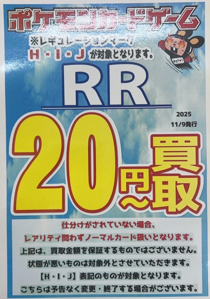 ポケカスタンダードレギュレーション告知により、買取範囲に変更が御座います。 2025年11月10日 ポケカスタンダードレギュレーション告知により、買取範囲に変更が御座います。 お持込のお客様はご注意ください。 ※2025/11/10現在の価格となります。 在庫状況・状態によってお値段が変動いたします。予めご了承ください。 **************** こちら↓もぜひチェックしてみてくださいね♪(*´▽`*) ・最新のイベント情報はこちら ・最新の買取情報はこちら