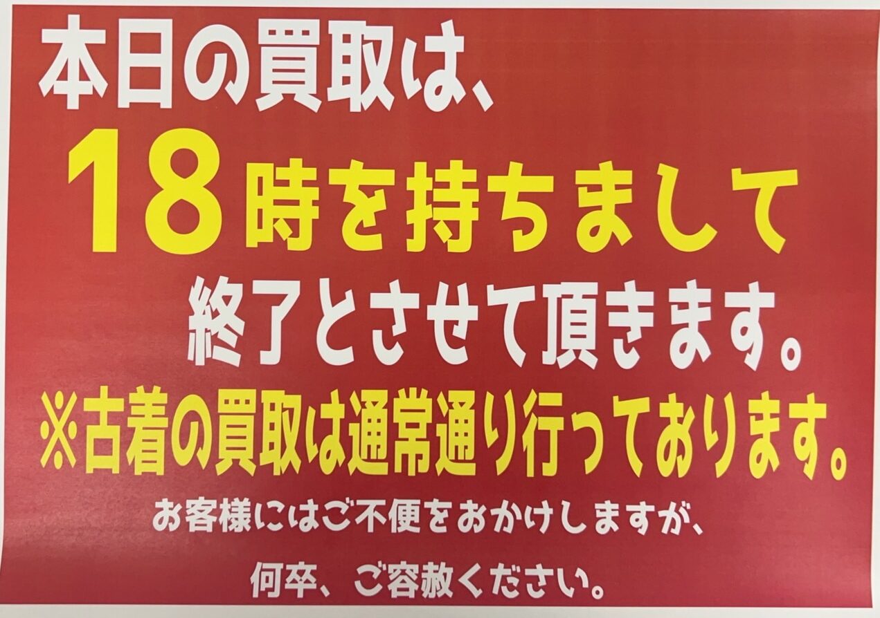 ■【重要】1月15日 買取時間変更のお知らせ。■ 2026年1月15日 ★古着コーナーよりお知らせ★ 買取時間変更のお知らせ。 本日、1月15日の買取について諸般の事情により18時までとさせて頂きます。ご容赦ください。 また、古着の買取については通常通り行なっております。