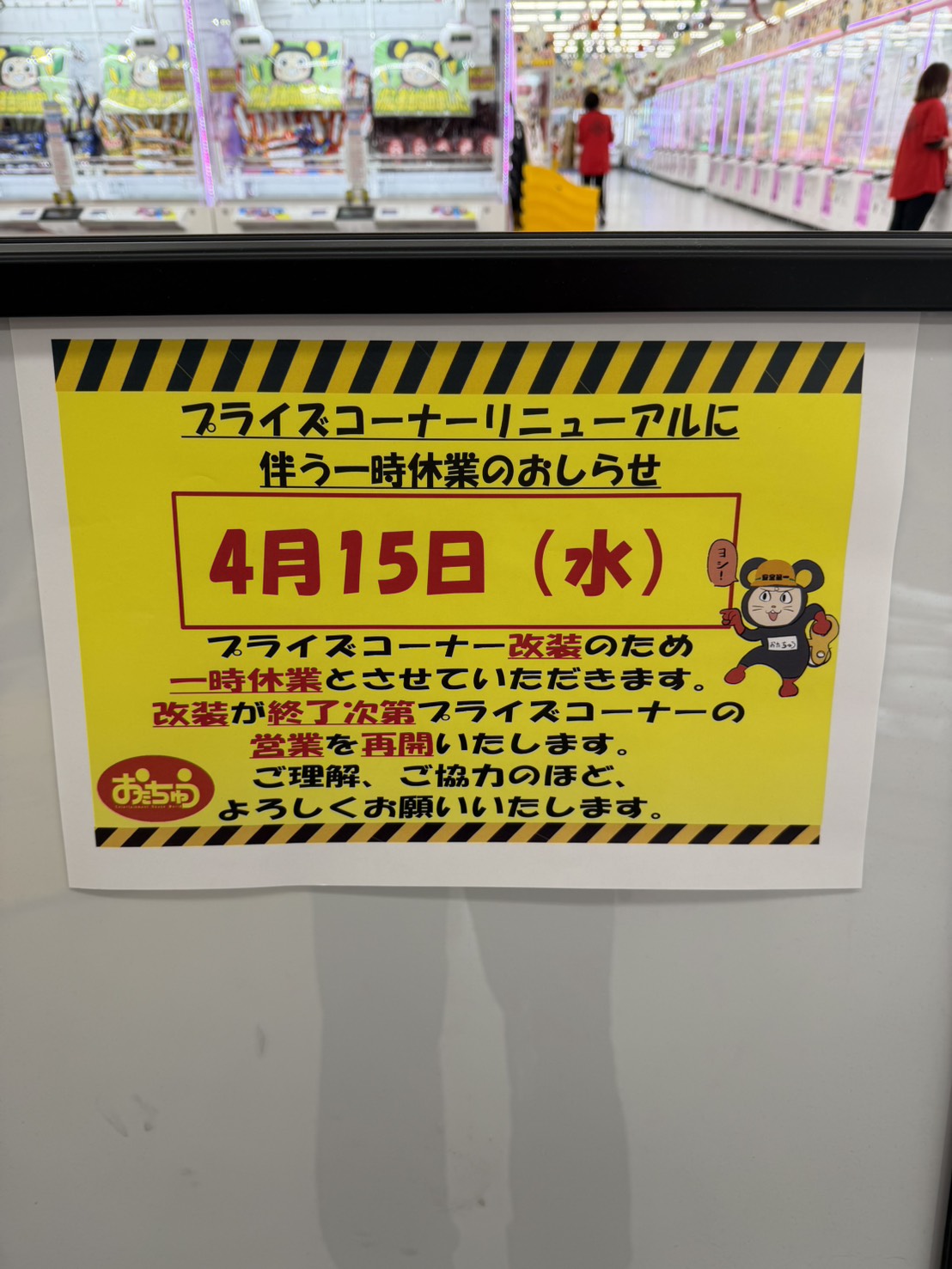 ★プライズコーナー改装のお知らせ★ 2026年4月15日水曜 プライズコーナー 新台投入に伴い封鎖となります。