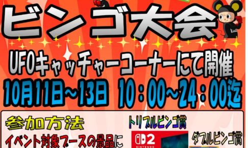 ★プライズコーナー、イベントのお知らせ★ 10月11日~13日の3連休 プライズコーナーにて、イベント開催致します‼ 今回のイベントはこちらっ‼ セルフビンゴ‼ 当選者には豪華景品が待ってます‼ ただし、各等賞に数の限り…